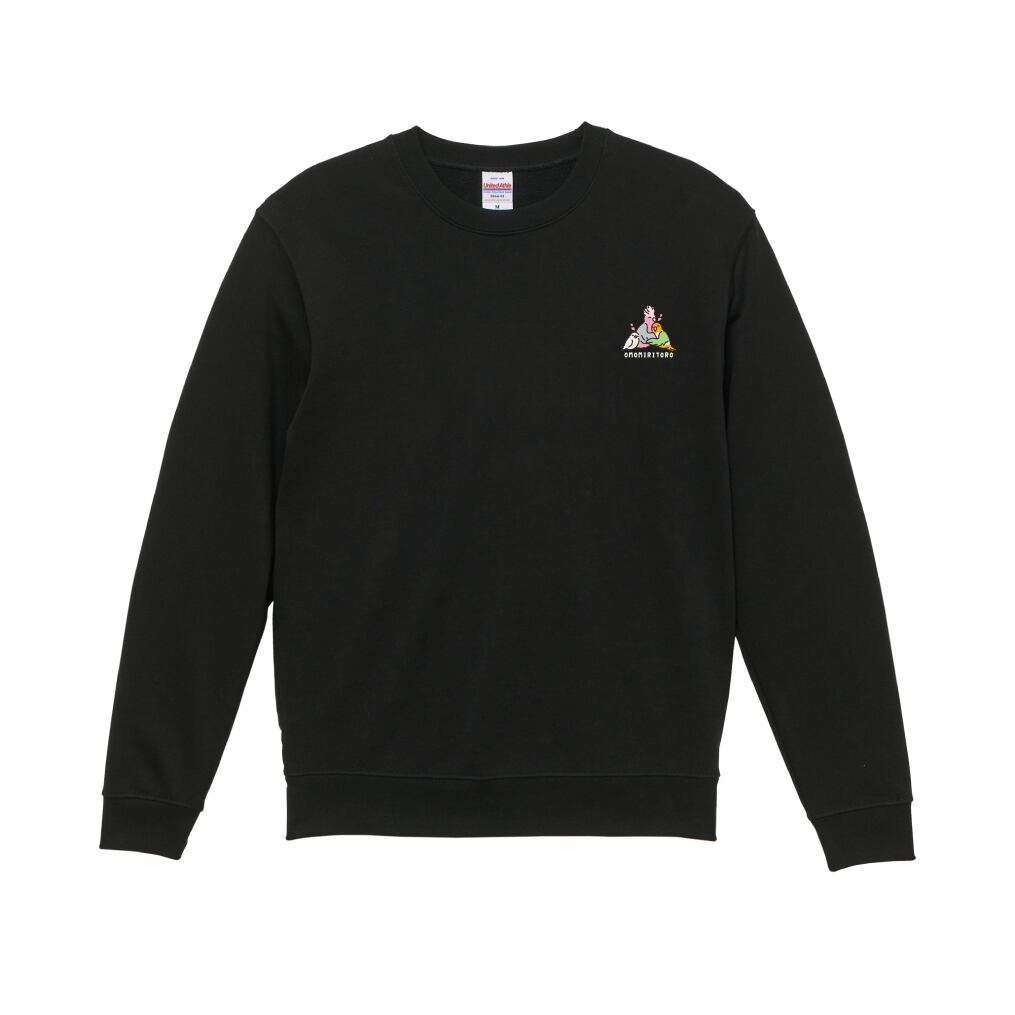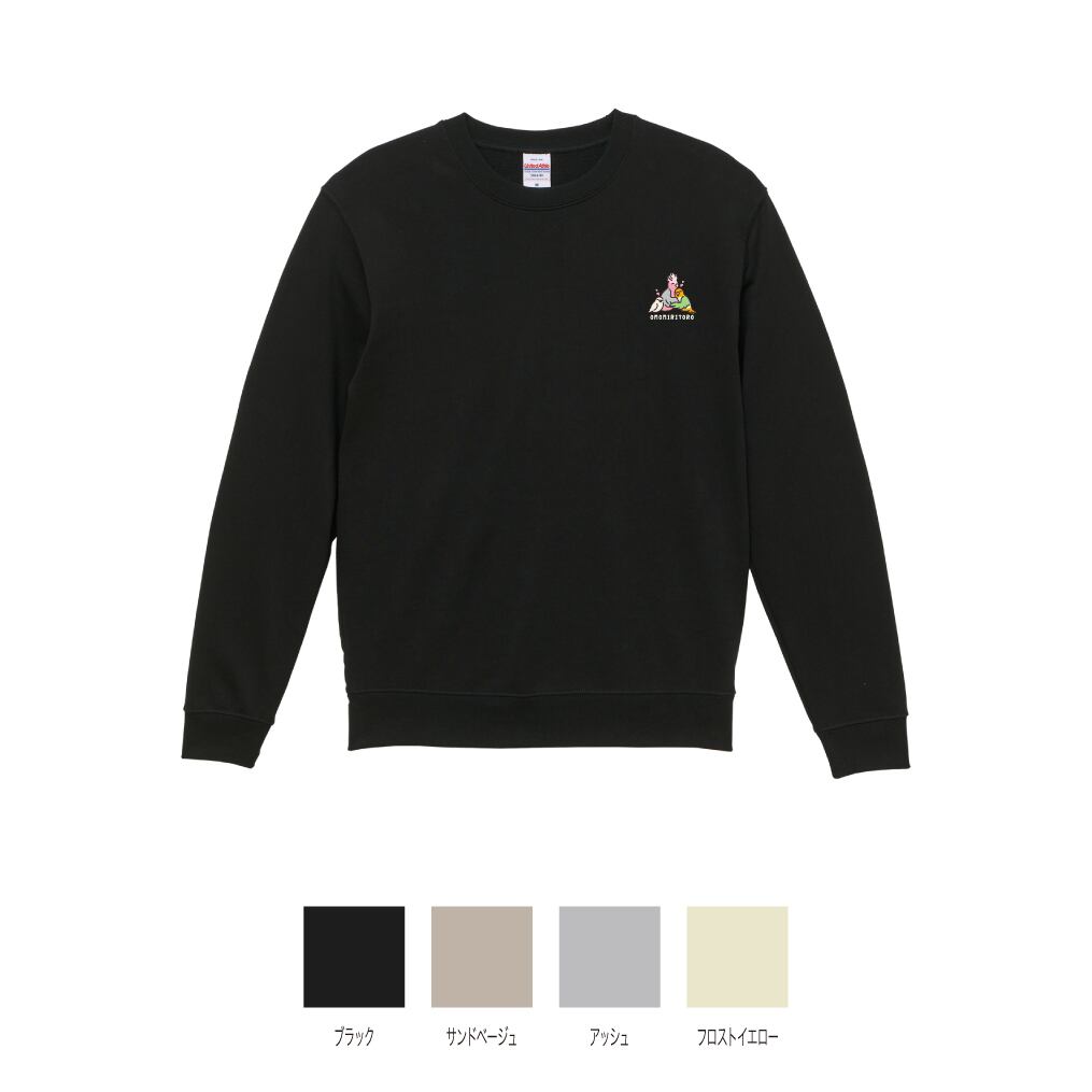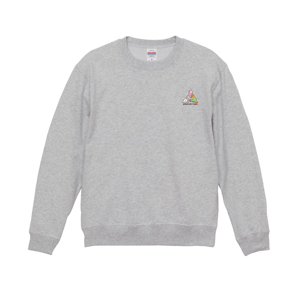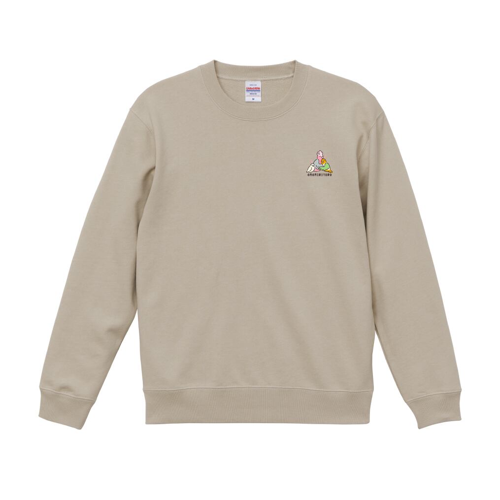 “OMOMIRITORO”のロゴと、3羽が抱き合う姿を刺繍したスウェット。