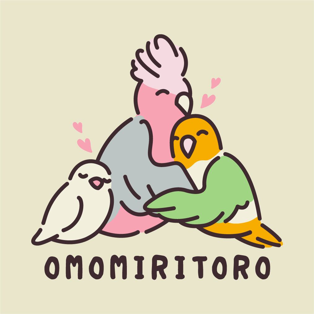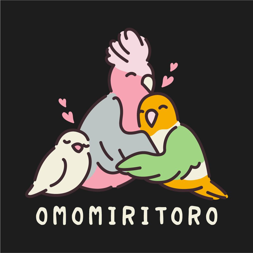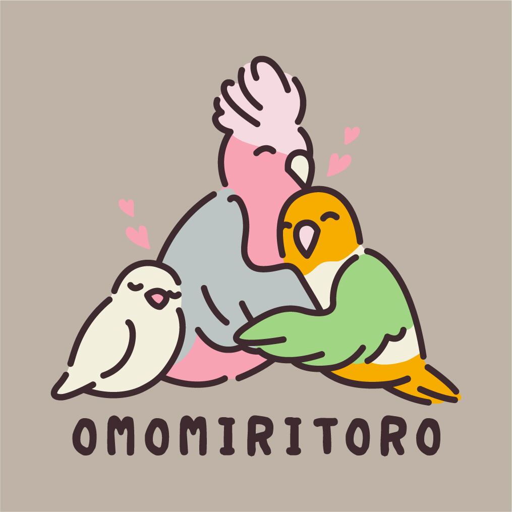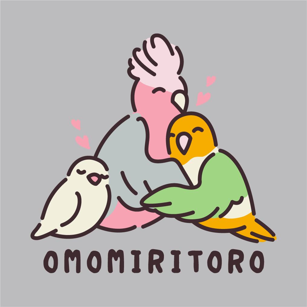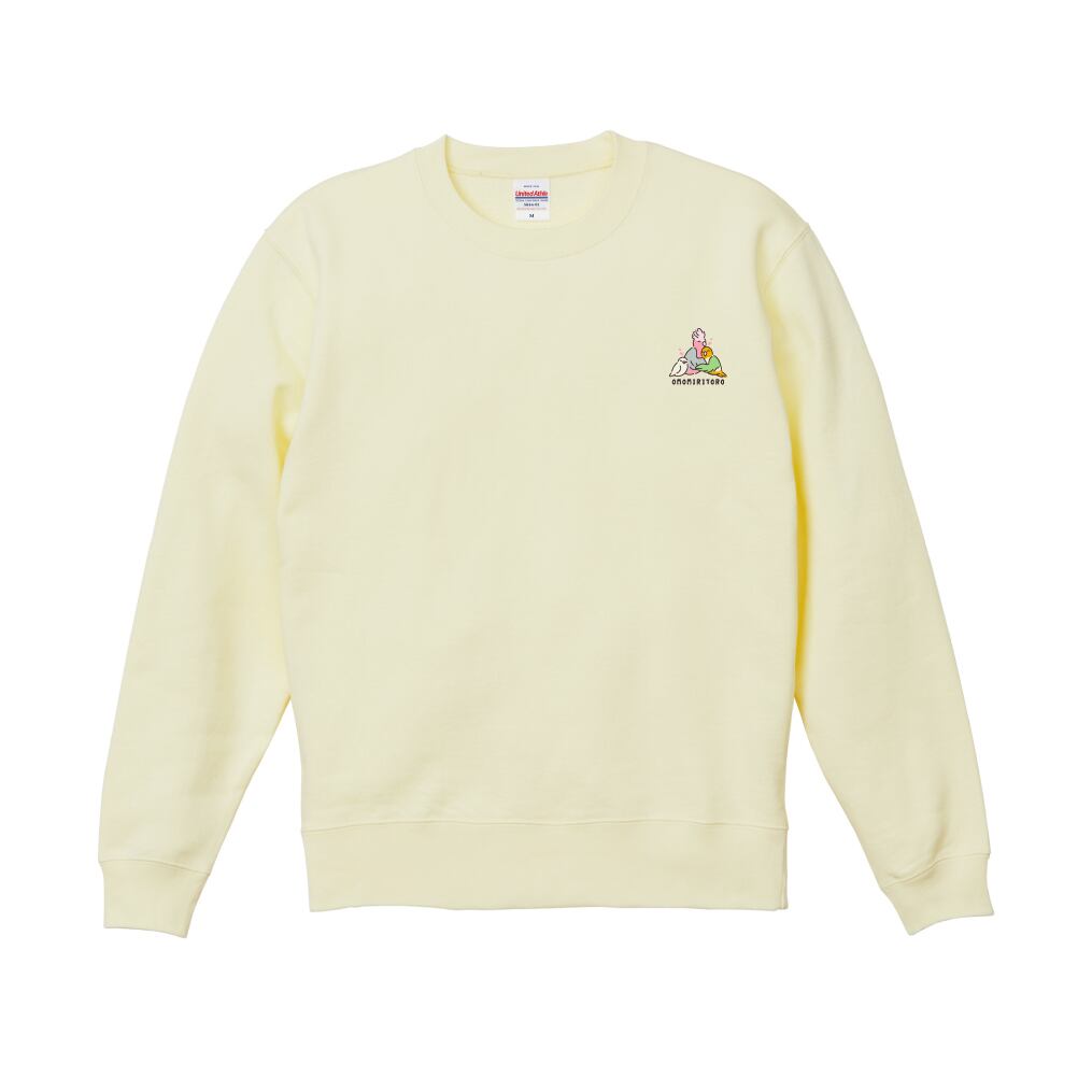 “OMOMIRITORO”のロゴと、3羽が抱き合う姿を刺繍したスウェット。